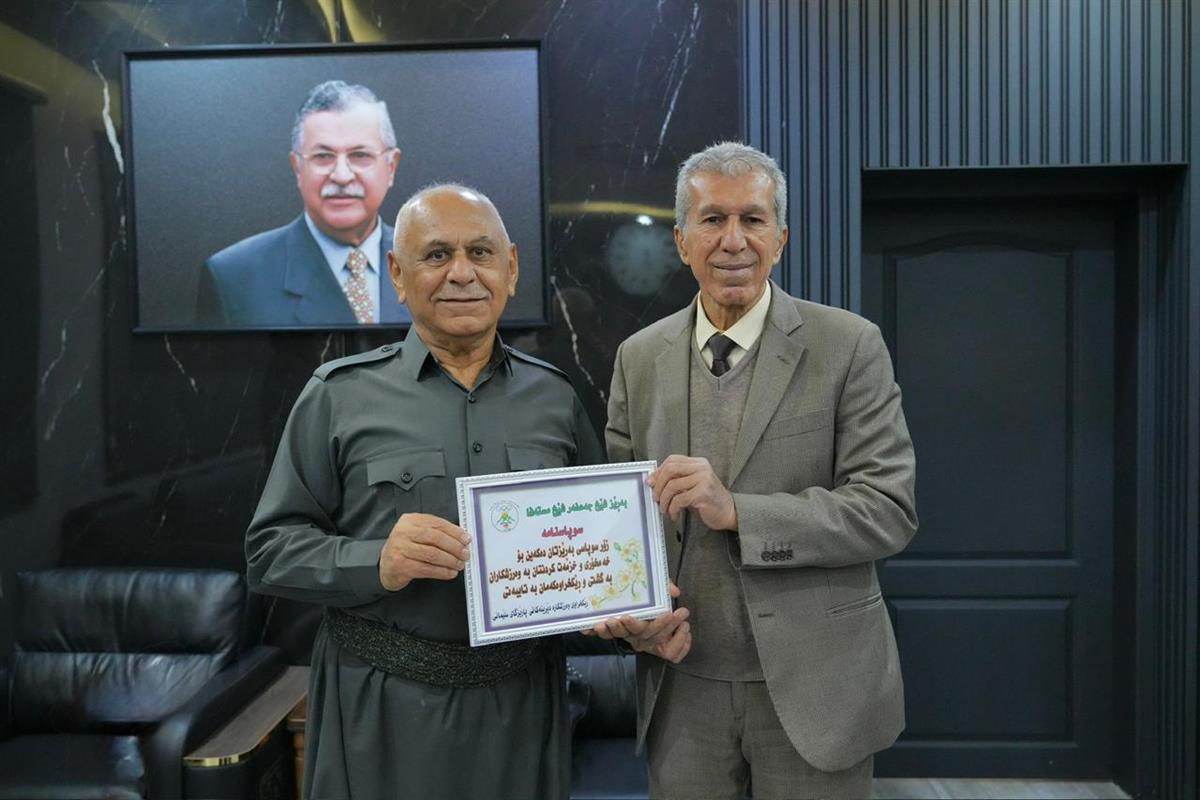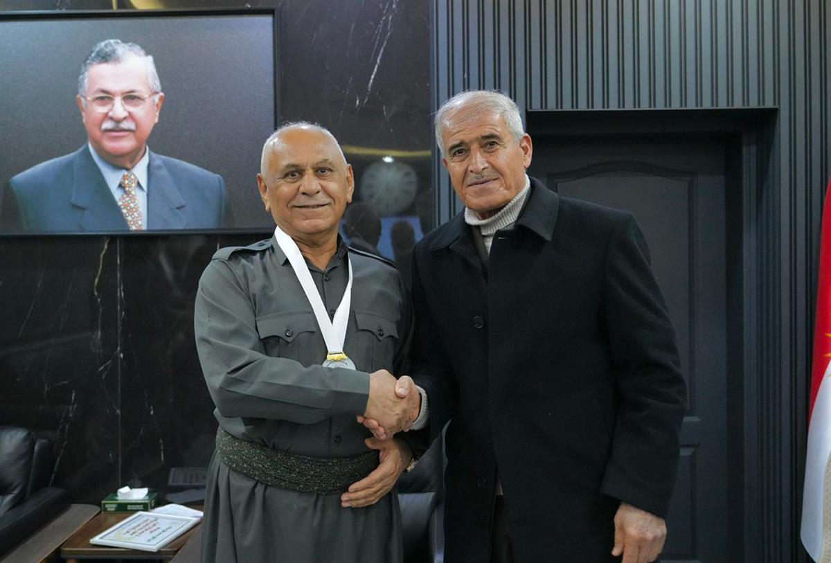 ئەمڕۆ دووشەممە 16ی ئاداری 2026، لەرێوڕەسمێکدا، هەڤاڵ شێخ جەعفەر شێخ مستەفا، لێپرسراوی ئەنجومەنی پاراستنی بەرژەوەندییە باڵاکانی یەکێتیی نیشتمانیی کوردستان، لەبارەگای ئەنجومەن، خەڵات و مەدالیای رێزلێنانی رێکخراوی وەرزشکارە دێرینەکانی پارێزگای سلێمانی پێشکەش کرا.